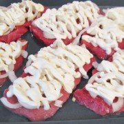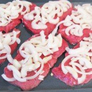 Каждый пласт посолить, поперчить, уложить на смазанный маслом противень. На каждый кусочек обильно выложить лук, порезанный полукольцами.