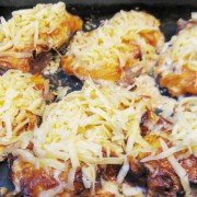 Достать противень с мясом. Каждый кусочек посыпать сыром, натертым на крупной терке. Запекать еще 10 минут (до румяности сыра).